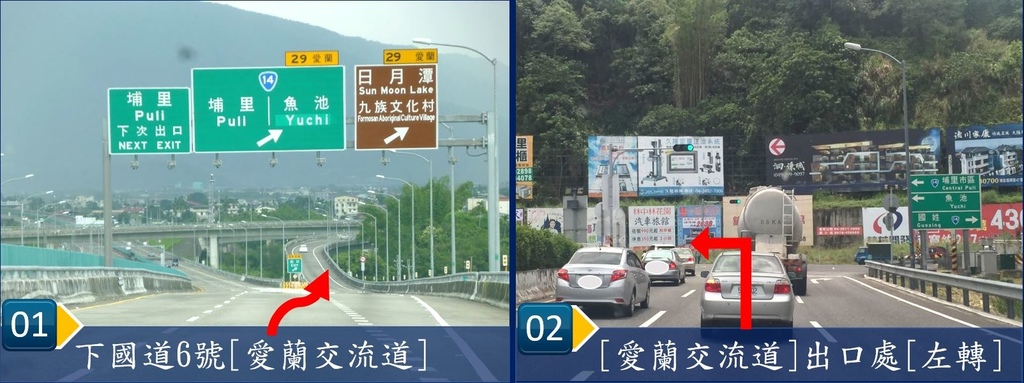於行駛國道六號往埔里方向於[愛蘭交流道]下高速公路,下交流道後於T字路口處[左轉]後直行